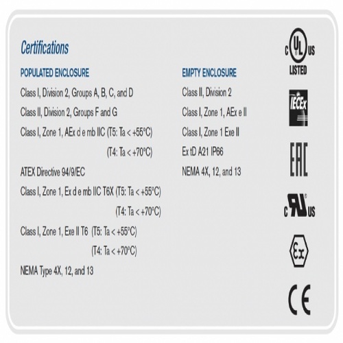 Adalet CN4X6-202406U - Adalet’s Single Door Clamped Control Enclosures in 316L stainless steel include standard features such as silicone gaskets, a removable hinge pin, internal standoffs for mounting pans, and ground studs on both the box and cover, with an external earthing stud. Customizable options include gland plates, drilled entries, Adalet EH series Exe operators, terminal block assemblies, and various nameplates. The enclosures are constructed from 14 gauge stainless steel with a #3/4 brush finish and are available in 68 standard sizes, featuring a stainless steel quarter-turn latch, watertight silicone gasket, continuous piano hinge, and wall mounting feet.