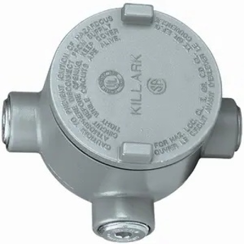 Killark GRR-3 - Cast conduit hubs with integral bushings - Blank cover included - Replacement cover catalog number GRRBC - Compact size - Supplied with five hubs and three close-up plugs GR series are the go to outlet bodies for multiple hub configurations and are installed to protect conductors in threaded rigid conduit. Some configurations offer mounting lugs with cover included. All GR series are available in the copper-free aluminum with our superior electro-statically applied paint, some are available in our Duraloy® iron. Application: Conduit boxes installed in conduit systems within hazardous areas to: protect conductors in threaded rigid conduit, act as pull and splice boxes, interconnect lengths of conduit, change conduit direction, and provide access to conductors for maintenance and future system changes.