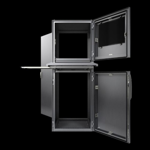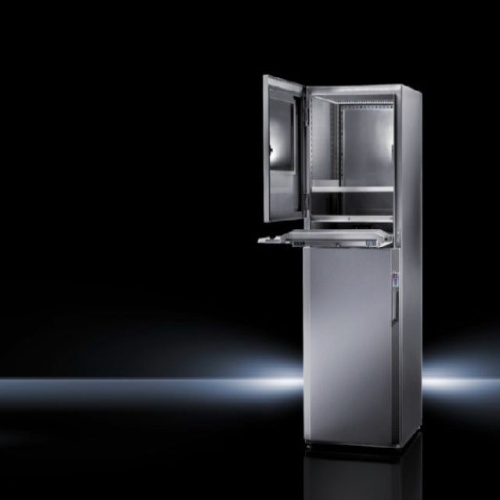 Rittal 4650150 - Includes: Housing, solid top and sides, Rear door with locking rod, Glazed door at the top, latched from the inside, Component shelf, Keyboard drawer with fold, down front door for handrest and mousepad tray, Lock insert, lock no. 3524 E, Bottom door with locking rod, Base plates, divided