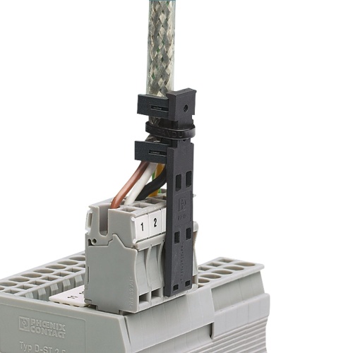 The connecting cable for the shielding is connected via the plug and then makes direct contact with the terminal block when inserted