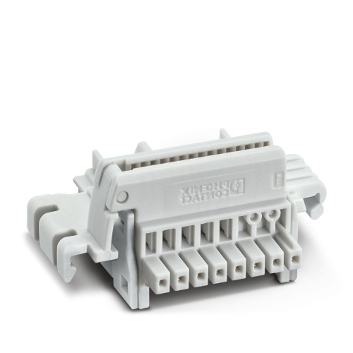 Phoenix Contact 2202894 The DIN rail bus connector is a light gray component with a nominal current rating of 6A and 4A for parallel and serial contacts respectively. It has an electrical rating of 32V, consists of 8 positions, and features gold-plated contacts, suitable for connecting electronics housings via 7 parallel contacts and 1 serial contact. The connector is mounted directly onto a DIN rail using no locking mechanism or additional mounting method.