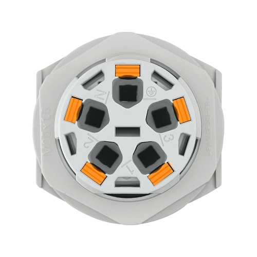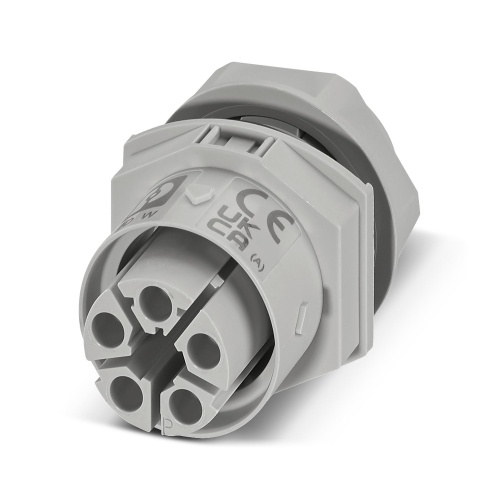 Phoenix Contact 1088692 The panel feed-through for connectors features a push-in connection method with up to 8 positions available (4+PE), including M25 sizes with copper or aluminum cores ranging from 0.5-2.5 mm², operating at 600 V and 17.5 A with a protective jacket in PA material, a gray color, and coded with the letter "P".