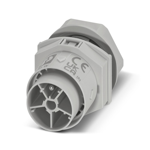 Phoenix Contact 1088691 The panel feed-through for connectors in the IPD product family features a push-in connection with four or more pins, ranging from 0.5mm² to 2.5mm², and operates at 600V with a maximum current of 17.5A, while also being coded as P (gray) in color.
