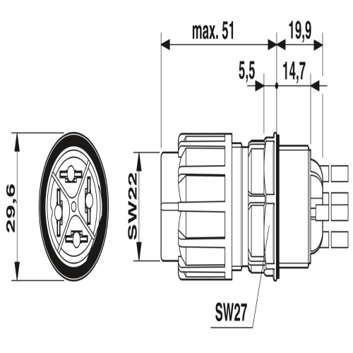 Phoenix Contact 1582196 The panel feed-through product family is QPD and features a spade connection for slip-on sleeves following DIN 46247-2 standards, accommodating up to 3+PE positions, M25 pins, and carrying currents of 1-20 A at 690 V with a black PA material and no QUICKON nut present; it has an external cable diameter ranging from 6-14 mm and features 2.5 mm2 conductors.