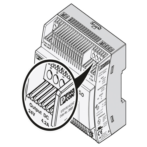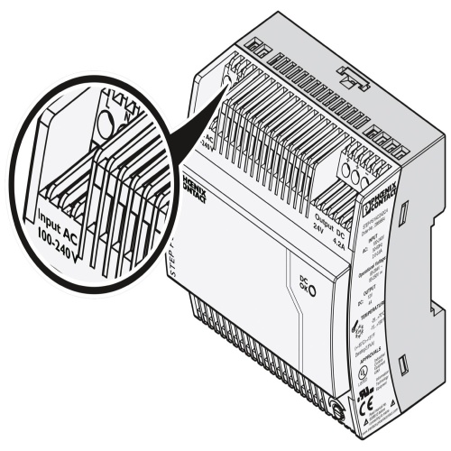 STEP-PS/ 1AC/24DC/4.2 Phoenix Contact STEP-PS/1AC/24DC/4.2. 24 volt 4.2 Amp Power Supply(Class 1 Div 2) and 85-264 Vac or 95-250 Vdc input voltage. Din rail mount Screw Connection. Temperature range of -13 F to 158 F. Din rail mount.