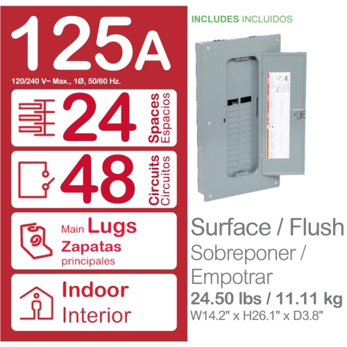 Schneider Electric HOM2448L125PQGC - Single Phase 3 Wires, 125 Amp, 10 kA, 120/240 VAC, 48 Spaces - 26.02" x 14.3" x 3.7" (HxWxD)