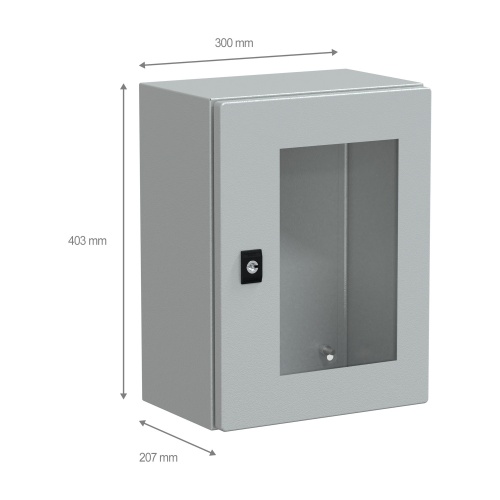 The compact enclosure is made of steel (body), steel and security glass (door), making it durable and resistant