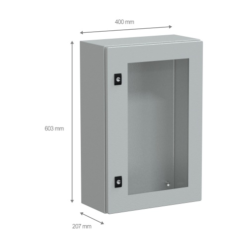 The compact enclosure is made of steel (body), steel and security glass (door), making it durable and resistant