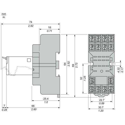 Socket is finger-safe according to IP20, and compatible with DIN rail or panel mounting.
