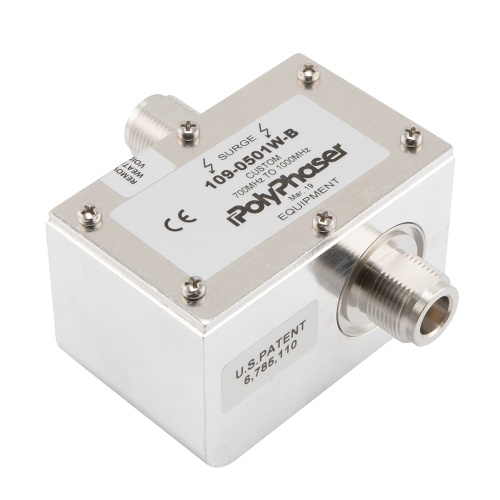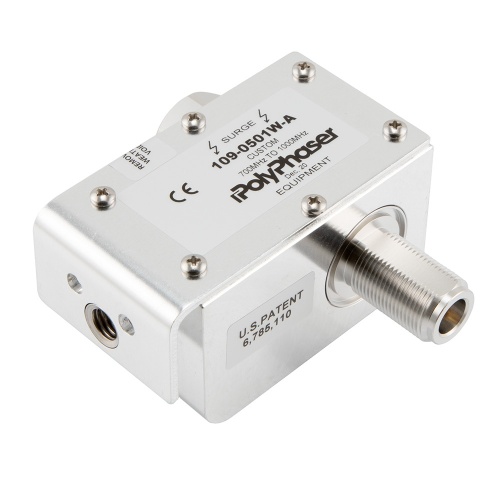 Our radio frequency coaxial surge protector product is commonly used for radio and antenna installations where part or all system equipment is outdoors to protect sensitive equipment and is designed to pass 5 MHz to 400 MHz while suppressing DC surge.While this radio frequency lightning surge suppressor operates in a range of frequencies from 5MHz to 400MHz, it is supporting a power handling maximum of 40 Watts.RF surge protector 108-1019A from PolyPhaser incorporates hybrid technology to provide protection for equipment at up to the max. power of 40W.Our coax surge protection device for RF is manufactured with a N type connection in and a type N out.108-1019A is constructed with a female gender for the input and male for the output.