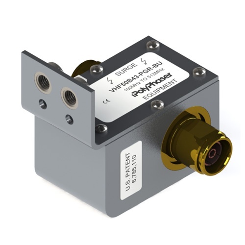 PolyPhaser coaxial RF surge protector (also known as lightning surge protector, lightning surge arrestor or suppressor) VHF50B43-BD is in-stock and will ship same-day as purchased.