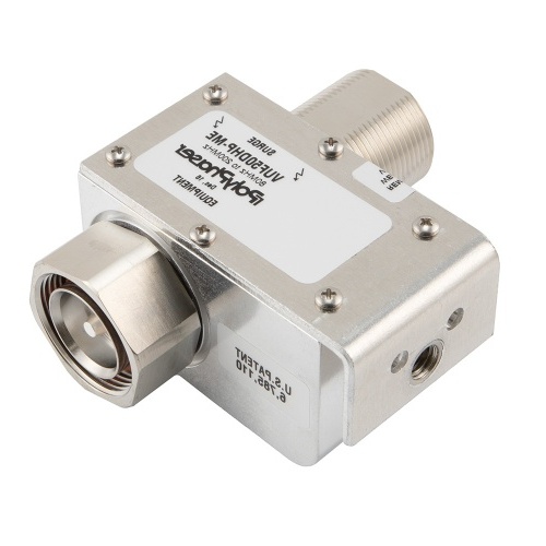 Our radio frequency coaxial surge protector product is commonly used for radio and antenna installations where part or all system equipment is outdoors to protect sensitive equipment and is designed to pass 80 MHz to 200 MHz while suppressing DC surge.While this radio frequency lightning surge suppressor operates in a range of frequencies from 80MHz to 200MHz, it is supporting a power handling maximum of 1 kWatts.RF surge protector VUF50DHP-ME from PolyPhaser incorporates hybrid technology to provide protection for equipment at up to the max. power of 1kW.Our coax surge protection device for RF is manufactured with a 7/16 DIN connection in and a 7/16 DIN out.VUF50DHP-ME is constructed with a female gender for the input and male for the output.