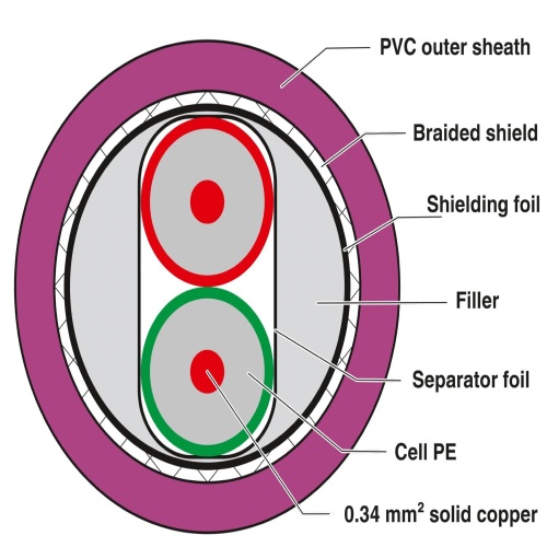 Phoenix Contact 2744652 The Bus system cable has a PROFIBUS connection with a data rate of 12 Mbps and is shielded in PVC FR VI/PVC material with a violet color, consisting of two wires one with a gauge size of AWG22/1, where the single color wire is red and green, and its length can vary from 1.0 to 1000.0 meters.