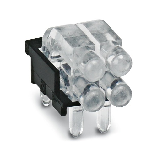 Phoenix Contact 2202317 A lighting system with multiple light guides featuring glare protection is available in a range of configurations, including models with raised heads and spherical emission surfaces. It features four displays arranged in two rows and two columns, with a pitch of 2.54mm and includes electrostatic discharge (ESD) protection up to <8 kV. These systems can be used with various housing types, such as ME, ME-MAX, ME-IO, ME PLC, and EH ranges, provided that the housing has been processed beforehand.