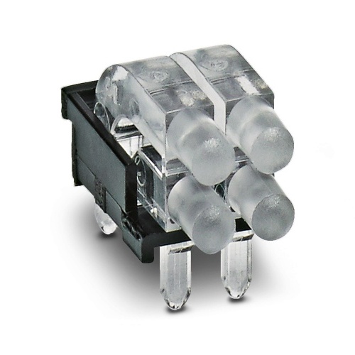 Phoenix Contact 1043044 This light guide features multiple glare protection surfaces, a passive and rigid construction with a raised head and conical emission surface shape. It consists of four displays arranged in a 2x2 grid layout with a pitch of 2.54 mm. The device offers ESD protection up to 8 kilovolts and can be used across various housing ranges including ME, ME-MAX, ME-IO, ME PLC, and EH.