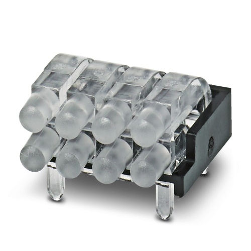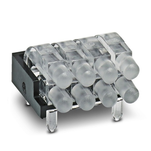 Phoenix Contact 1036724 The product features multiple light guides with glare protection, a raised head design, and conical emission surfaces that are spherical in shape. It has 8 displays arranged in a 2x4 configuration with a pixel pitch of 2.54 mm, providing good image quality. The device also includes ESD protection up to 8 kV and can be used with various housing ranges including ME, ME-MAX, ME-IO, ME PLC, and EH, requiring the housing to be processed before use.