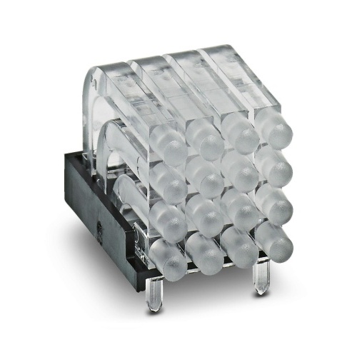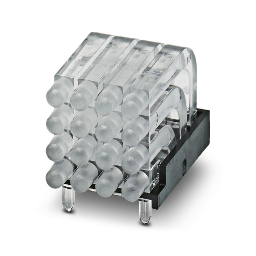 Phoenix Contact 1036727 This light guide features multiple glare protection units with a passive and rigid design, a raised head, and a conical emission surface that is typically spherical in shape. The device has 16 displays arranged in a 4x4 grid layout, with a pixel pitch of 2.54 mm. It also includes electrostatic discharge (ESD) protection with a threshold of less than 8 kV and can be used with various housing types including ME, ME-MAX, ME-IO, ME PLC, and EH, provided the housing has been properly processed.