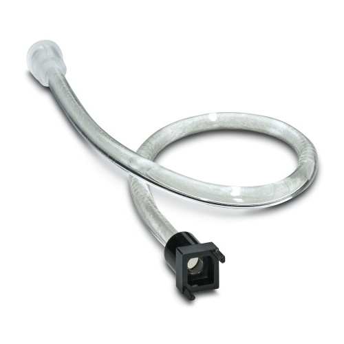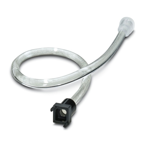 Phoenix Contact 1082301 A flexible light guide is created using transparent PUR material, paired with a crystal-clear PMMA lens that measures 6 by 6 millimeters. The assembly also features a 6x6 millimeter LED housing made of black PC, ensuring compliance with UL 94 HB safety standards and measuring 150 millimeters in length when unmounted.