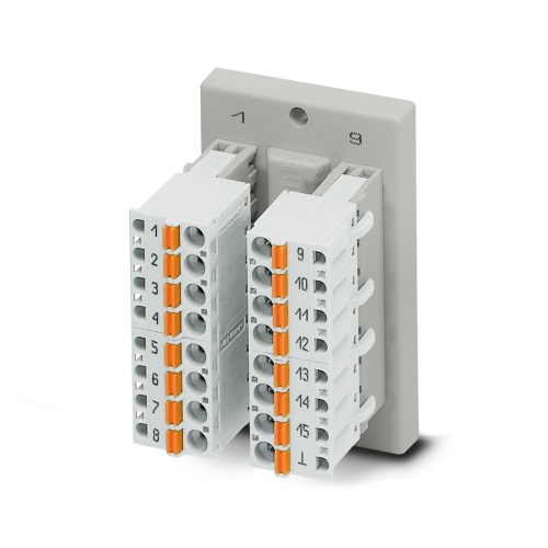 Phoenix Contact 2903054 The VARIOFACE feed-through module establishes a direct link between plug-in push-in spring-cage connection terminal blocks and a D-SUB miniature pin strip, accommodating up to 15 positions, while also providing an optional ground pick-off feature.