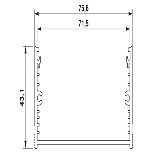 Phoenix Contact 2200966 The part features a press-drawn section housing with screw mounting capabilities, accompanied by a profile cover. The dimensions include an internal profile width of 71.5 mm, an external profile width of 75.6 mm, and a length of 130 mm, with a depth of 43.1 mm.
