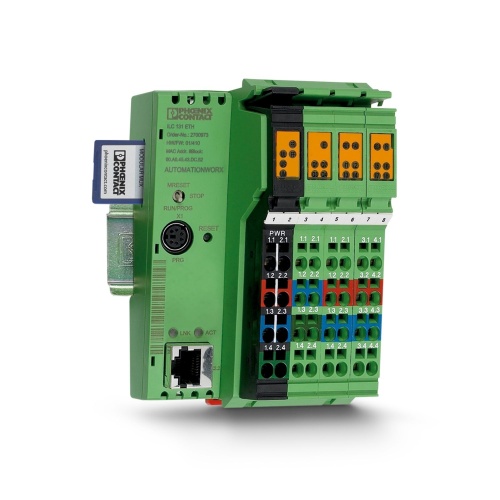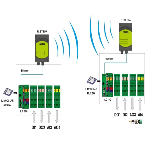 Phoenix Contact 2701872 Two standardised data cards, equipped with two ILC 131 Ethernet controllers and individual input/output terminals, can be combined to create an automatic multiplexing system that doesn't need any programming, instead allowing for easy configuration using just a few wire jumpers. This setup can also support wireless connections, Ethernet cables or network interfaces.