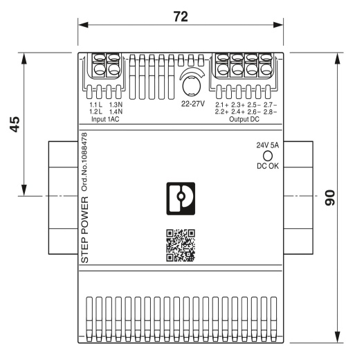 Phoenix Contact 1088478 The STEP POWER primary-switched power supply unit features a push-in connection and can be mounted on either a DIN rail or directly. It accepts a 1-phase input and produces a 24V DC output with a maximum capacity of 5A, allowing for adjustable voltage settings between 22V DC and 27V DC.