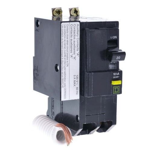 Schneider Electric QOB220GFI1200 - Mini circuit breaker, QO, 20A, 2 pole, 120/240VAC, 10kA, bolt on, 6mA grd fault A, pigtail, aux switch 1A