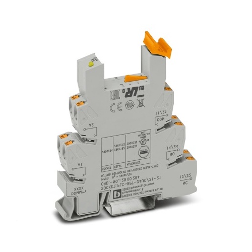 Phoenix Contact 2900284 A 14mm compact PLC terminal block featuring push-in connections is available, designed to be mounted on a DIN rail with a 35/7.5 profile and comes equipped with two changeover contacts, accepting an input voltage of either 24V AC or DC power supply.