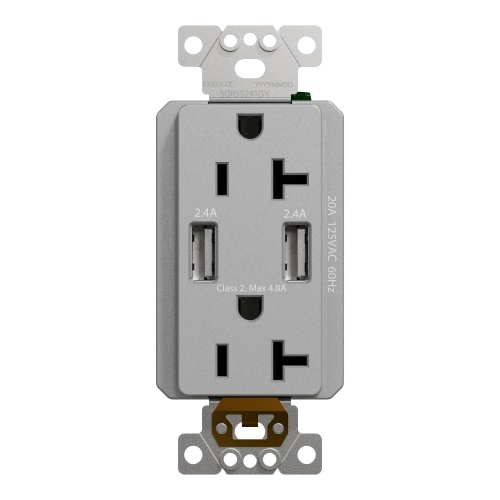 Schneider Electric SQR55241GY - USB charger + socket-outlet, X Series, 20A socket, 4.8A USB A/A, duplex, tamper resistant, gray, matte finish