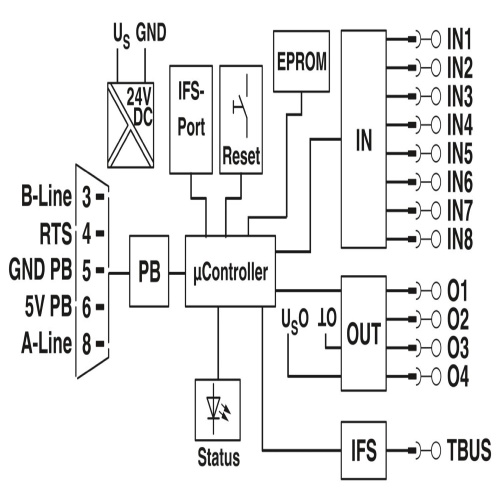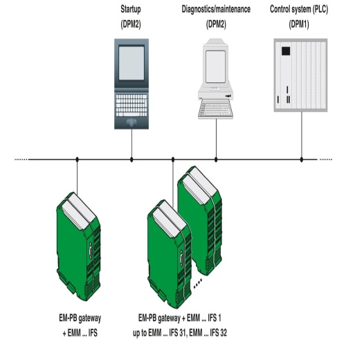 Phoenix Contact 2297620 The device connects up to 32 interface system devices to a higher-level controller through PROFIBUS DP, utilizing DIN rail connectors for connection to these devices which are already installed on the gateway itself.