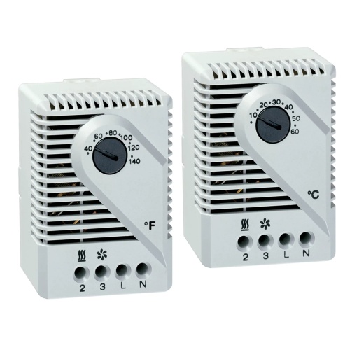 Mechanical thermostat for controlling filter fans and heaters. Registers surrounding air and can switch inductive and resistive loads via snap-action contact. Clips for vertically mounting on 35 mm DIN rail (EN 60715). An integrated resistor (RF) can be connected to improve the switch temperature differenceanical thermostat for controlling filter fans and heaters.