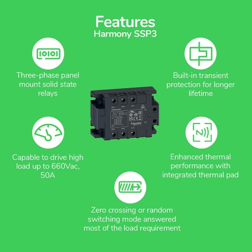 Schneider Electric SSP3A250BDRT - three phase relay, Harmony Solid State Relays, 50A, panel mount, random switching, thermal pad, input 4 to 32V DC, output 42 to 660V AC