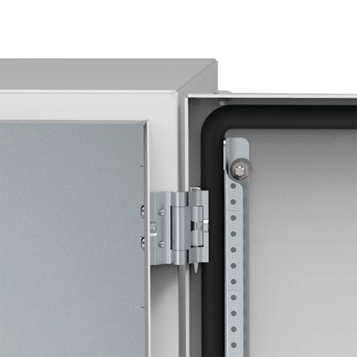 nVent Hoffman MMH02 IEC 180 Degree Hinges With the 180-degree hinges installed, the door opens fully to the side, allowing full access for operations inside the enclosure whitout interfering with the movement of personnel in the front.
