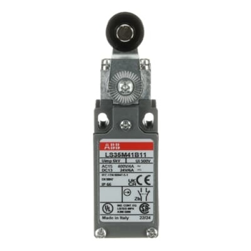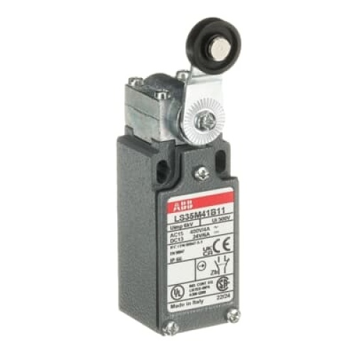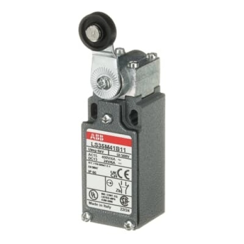 ABB LS35M41B11 - LS35M41B11 is a 30 mm wide, standard Limit Switch made of zinc alloy material (Zamak), with 2 mounting holes at the top, 1 1/2'' NPT cable entry on the bottom, plastic roller lever (Ø18 mm) actuator and 1 N.O + 1 N.C snap action (Zb type) contacts
