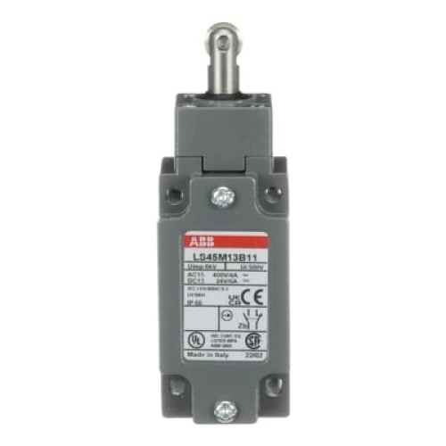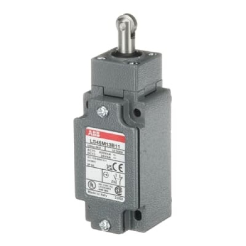 ABB LS45M13B11 - LS45M13B11 is a 40 mm wide, standard reinforced Limit Switch made of zinc alloy material (Zamak), with 4 mounting holes at the top and bottom, 1 1/2'' NPT cable entry on the bottom, stainless steel roller plunger actuator and 1 N.O + 1 N.C snap action (Zb type) contacts