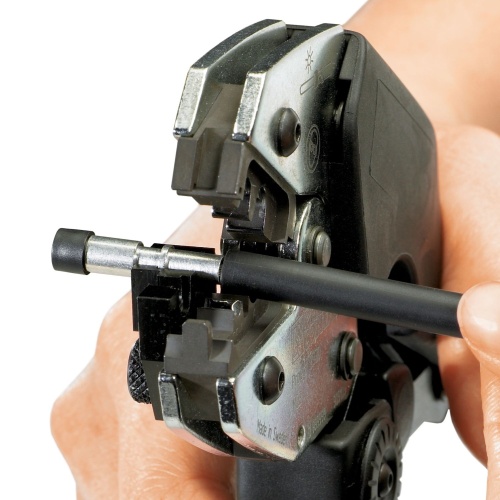 Phoenix Contact 1212469 The crimping pliers designed for SOLARLOK solar connectors can be adjusted to accommodate various wire sizes between 2.5mm² and 6mm² by using a pressure lock mechanism that allows for easy unlocking of the lateral entry, enabling users to securely connect wires of different diameters.