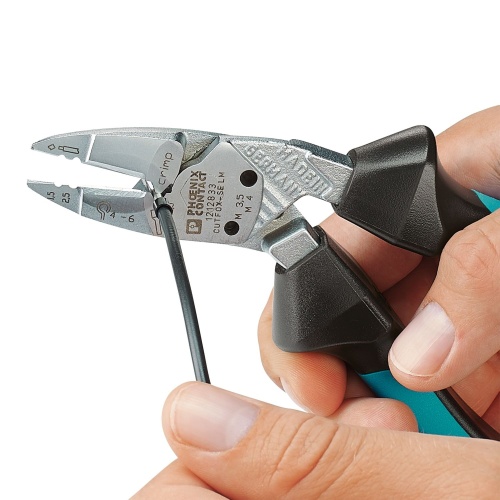 Phoenix Contact 1212833 The electrician's tool features an angular cut made by its diagonal edge, a distinctive design element that also houses stripping and crimping areas, and measures 180 millimeters in length.