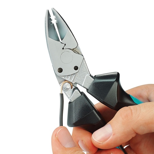 Can strip (1.5 mm² and 2.5 mm²), crimp (1.5 mm² ... 2.5 mm²), cut brass screws, and bend eyes (diameter: 4, 5, 6 mm)
