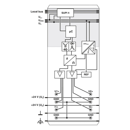 Phoenix Contact 2700775 The output terminal features an inline analog output with a range of 0-10V for both positive and negative voltages, as well as two sets of analog outputs ranging from -10V to 10V and 4mA to 20mA. The connection is achieved through a 2-conductor setup, transmitting at a local bus speed of 500 kbps and boasting an IP20 degree of protection, complete with an inline connector and labeling field.