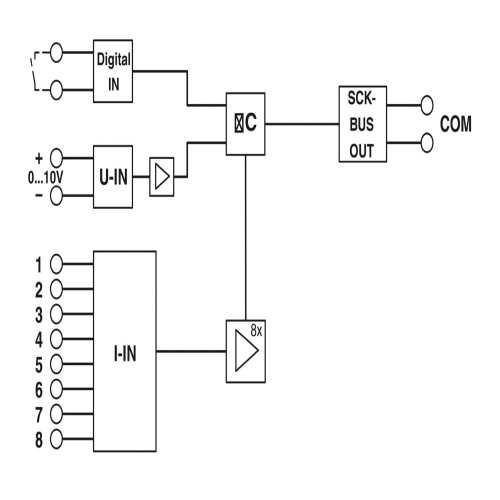 Phoenix Contact 2903241 A SCK measuring module designed specifically for monitoring photovoltaic systems features eight channels for current measurement, each capable of detecting up to 20 amps, one digital input channel, and interfaces that enable communication with both an SCK communication module and a separate voltage measuring module.