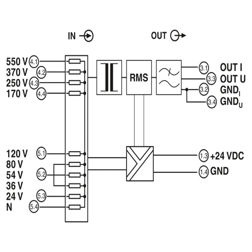Phoenix Contact 2906244 The MACX MCR voltage transducer is designed to measure and convert AC voltages within a range of 0V to 20V AC and 0V to 660V AC into an output signal, with a scale factor that translates the input voltage into a corresponding output current between 0A to 10A/4A to 20mA.