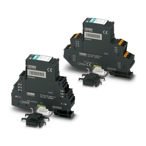 Phoenix Contact 2801219 A surge protection system consists of a protective plug and a base element that features an integrated multi-stage status indicator for use with four signal wires sharing a common reference potential, suitable for applications involving safety-related circuits up to SIL 3 level of reliability.