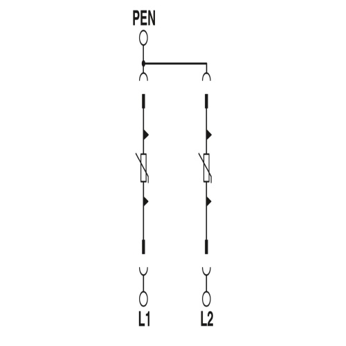 Phoenix Contact 2905342 A plug-in surge arrester suitable for two-phase power supply systems that combine the earth and neutral conductors into a single conductor, typically used in three-conductor systems where live line and neutral are separate.