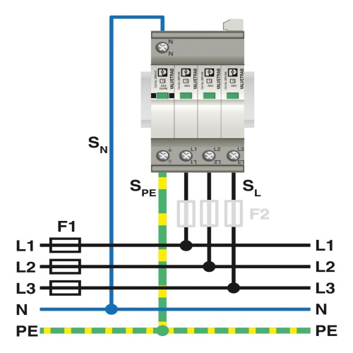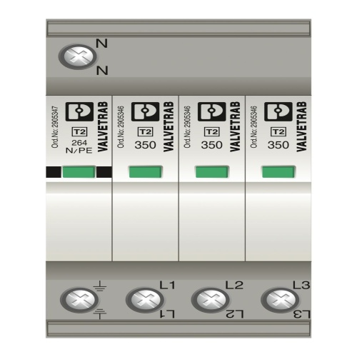 Phoenix Contact 2905345 A plug-in surge arrester designed to meet the requirements of a Type 2/Class II certification is intended for use in 3-phase power supply networks that utilize separate neutral (N) and earth (PE) conductors. Typically, this type of system utilizes five individual conductors, including three phase wires (L1, L2, L3) and two additional conductors for the neutral (N) and earthing (PE) connections, resulting in a total of five conductors: L1, L2, L3, N, PE.