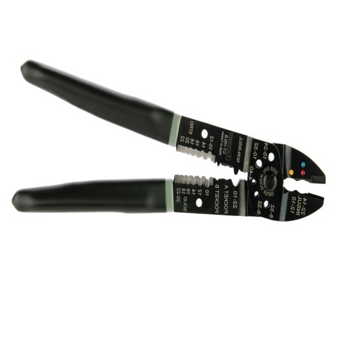 Crimps most panduit terminals, cuts wire and non-hardened screws, and strips wire.