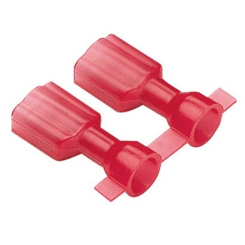 Panduit DNF18250FIMX-2K The vibration resistant male tab disconnect is made of brass and is nickel-plated. It is fully insulated in a red, nylon standard housing and has an expanded wire entry area. It has a tab size of 0.250 x 0.032" (6.3 x 0.8 mm) and supports a wire range of 22-18 AWG (0.5-1.0 mm²). It is 0.97" (24.6 mm) long and 0.41" (10.4 mm) wide. The disconnect has an expanded barrel configuration and a butted seam barrel. It comes in reels of 2000 pieces.