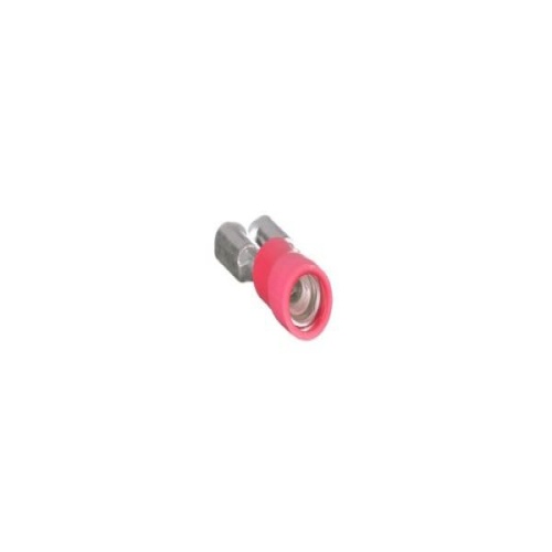 Panduit DVF18-250-MY The vibration resistant female disconnect is made of brass and is tin-plated. It is barrel insulated in red vinyl housing. It has a tab size of 0.250 x 0.032" (6.3 x 0.8 mm) and supports a wire range of 22-18 AWG (0.5-1.0 mm²). It is 0.81" (20.6 mm) long and 0.29" (7.4 mm) wide. The disconnect has a funnel entry barrel configuration and an insulation grip sleeve barrel. It comes in boxes of 1000.