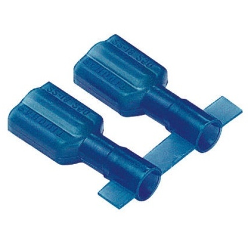 Panduit DNF14-206FIB-3K The vibration resistant female disconnect is made of brass and housed in blue, fully insulated nylon standard receptacle housings. It has a tab size of 0.187/0.205 x 0.020" (4.8/5.2 x 0.5 mm) and supports a wire range of 16-14 AWG (1.5-2.5 mm²). It is 0.78" (19.8 mm) long and 0.31" (7.9 mm) wide. The disconnect is tin-plated, has a funnel entry configuration and insulation grip sleeve barrel. It comes in bottled packages of 100.