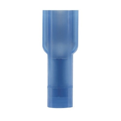Panduit DNG14-250FB-M The Supra-Grip™ female disconnect is made of brass and is tin-plated. It is fully insulated in blue nylon. It has a tab size of 0.250 x 0.032 (6.3 x 0.5 mm) and supports a wire range of 16-14 AWG (1.5-2.5 mm²). It is 0.93" (23.6 mm) long and 0.35" (8.9 mm) wide. The disconnect has a double crimp funnel entry barrel configuration and a butted seam barrel with an integrated metal insulation grip. It comes in boxes of 1000.