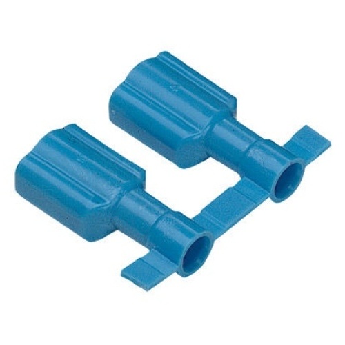 Panduit DPF14-250FIM-2K The vibration resistant male disconnect is made of brass and is nickel-plated. It is fully insulated in blue premium nylon housing. It has a tab size of 0.250 x 0.032" (6.3 x 0.8 mm) and supports a wire range of 16-14 AWG (1.5-2.5 mm²). It is 0.9" (22.9 mm) long and 0.41" (10.4 mm) wide. The disconnect has a funnel entry barrel configuration and a butted seam barrel. It comes in reels of 2000.